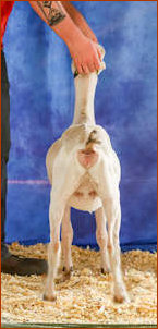 Stardust didn't disappoint when she freshened. She developed into a strong general appearance doe with body capacity to spare!! She is incredibly smooth and showy and really shows herself off when in the show ring. She also has a lovely, well attached mammary with a long, smooth fore and a lovely rear arch. One judge commented that this doe will a fun doe to show in the upcoming years! She was 2X 1st and 2X 2nd (to littermate sister, Dancer) at the Mid-MN Classic. This doe is also no slouch in the milk pail peaking at 14# as a first freshening yearling!!